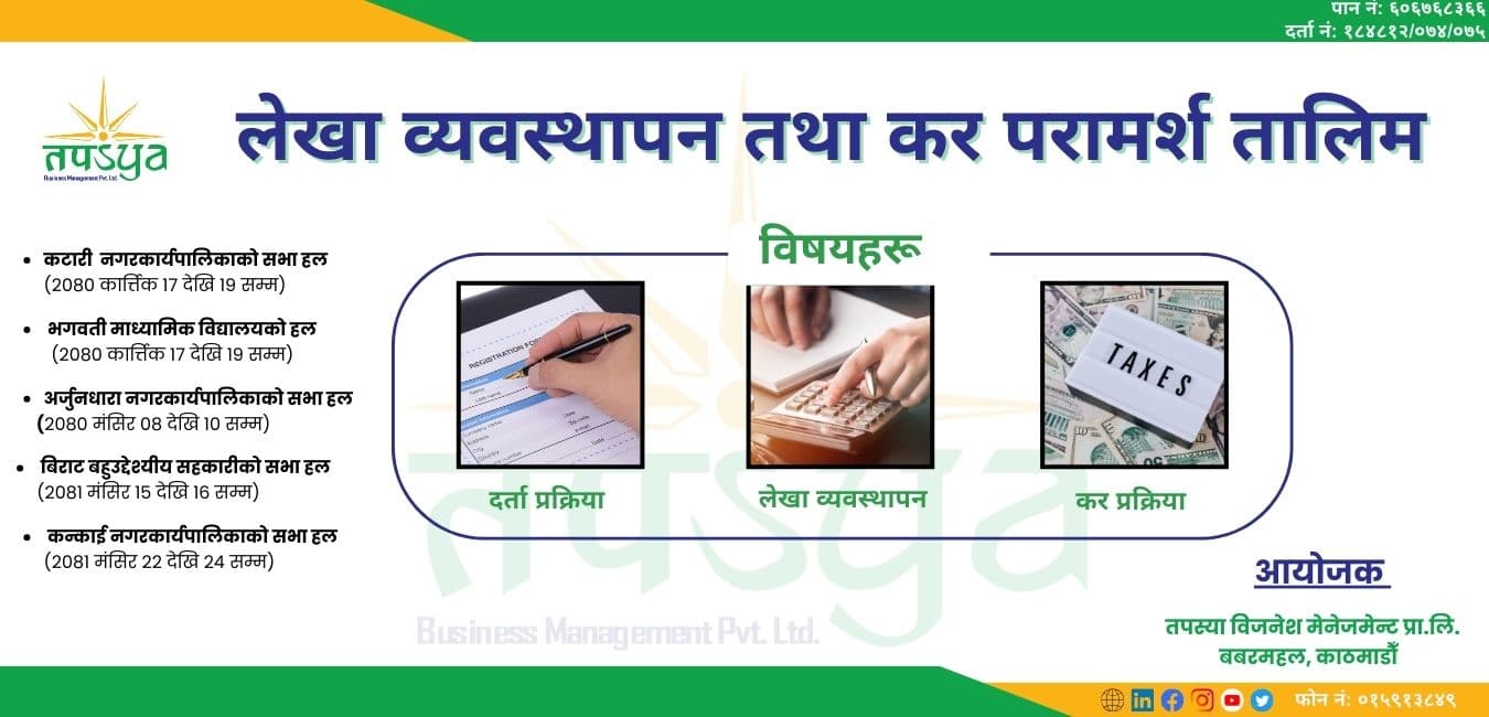 In an ever-evolving agricultural landscape, the need for financial literacy, effective business management, and taxation understanding is crucial for small and medium enterprises (SMEs) to thrive. Recognizing this, Tapasya Business Management Pvt Ltd organized a series of impactful training programs aimed at empowering Agri-SMEs across different municipalities. These events focused on equipping local entrepreneurs with essential skills and knowledge, fostering long-term sustainability and economic growth in their regions.